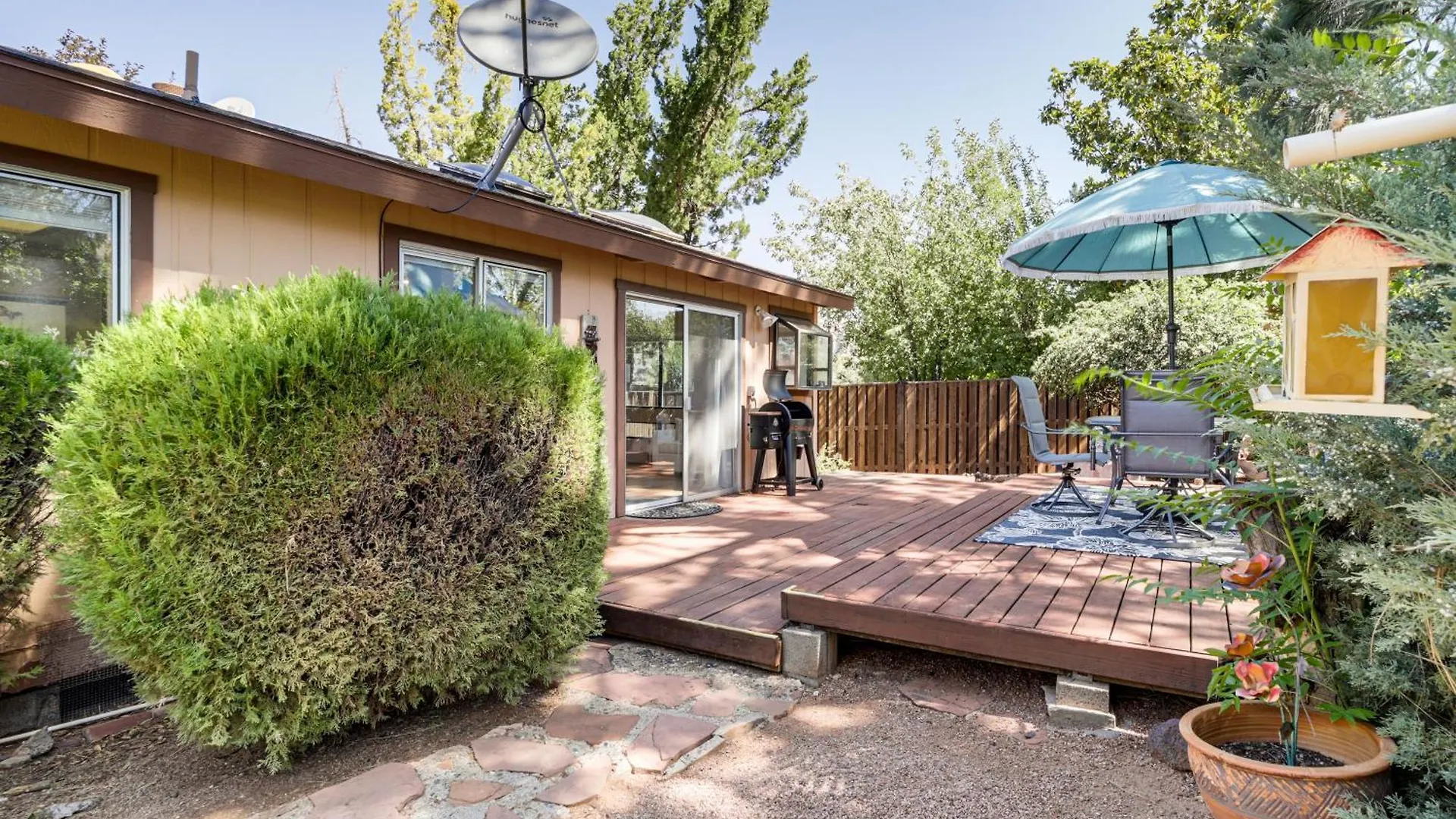 The kitchen amenities at the Sedona villa feature a fridge, a kitchenware, and a dishwasher, provided in an outdoor dining area. Beautiful Sedona Escape In Walkable Location! Villa is situated not far from Red Planet Diner. Beautiful Sedona Escape In Walkable Location! Villa is also just 5 minutes by foot from Mountain Shadows & Northview bus station.
